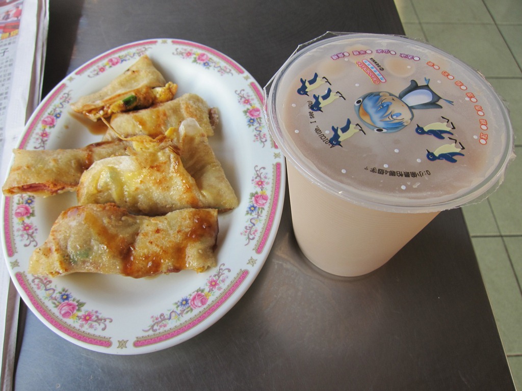 早餐,綜合蛋餅加上一杯小冰奶,營養也許不足,但熱量滿滿,正符合今日的需求!