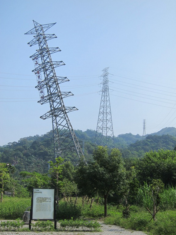 換個角度看,這是一根傾倒的電塔(對比後面兩座電塔的角度),是921地震所造成的,目前這根電塔就保留做為震災紀念鐵塔。