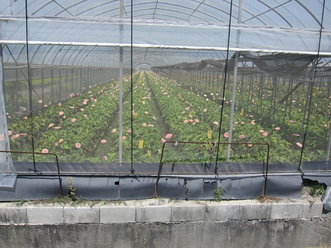 但沿著虛線走之後~~虛線常常就不見了~路標標示的花海區我怎麼走都看不到花海。右方的指示牌告訴我往左方兩百公尺就到了;騎了兩百公尺,看到招牌告訴我來時方向兩百公尺就到了,『 』,空格表示一句問候語。就在問候語完後,想想也許是認知的問題,我看著旁邊的溫室,這也算花海啊~所以我到底再找什麼呢?為什麼花海非得是向日葵、波斯菊、油菜花或海芋、金針花呢?溫室裡的玫瑰不算嗎?