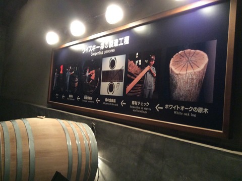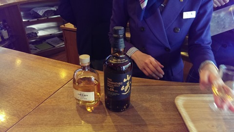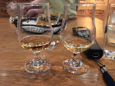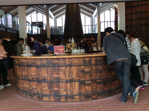 在酒廠導覽完畢後,遊客會被帶到試飲中心,第一杯是加冰塊的山崎威士忌!(那支黑色的東西就是導覽器!)!為了保持味覺的清晰度,他們還會多給一杯開水!